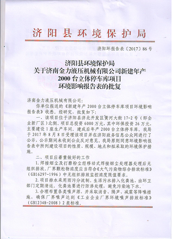 濟(jì)南金力液壓機(jī)械有限公司于20177月委托山東民通環(huán)境安全科技有限公司編制了《濟(jì)南金力液壓機(jī)械有限公司新建年產(chǎn)2000 臺立體停車庫項目環(huán)境影響報告表》,并于2017815日取得濟(jì)陽縣環(huán)境保護(hù)局的環(huán)評批復(fù)(濟(jì)陽環(huán)報告表[2017]86號)。項目于201712月份開工建設(shè),目前已建成投產(chǎn)。